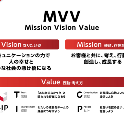 トランスコスモスのコンタクトセンターが取り組んでいる「MVV」。Mission(目標・使命)、Vision(ありたい姿)、Value(行動や考え方)の頭文字を取った言葉。